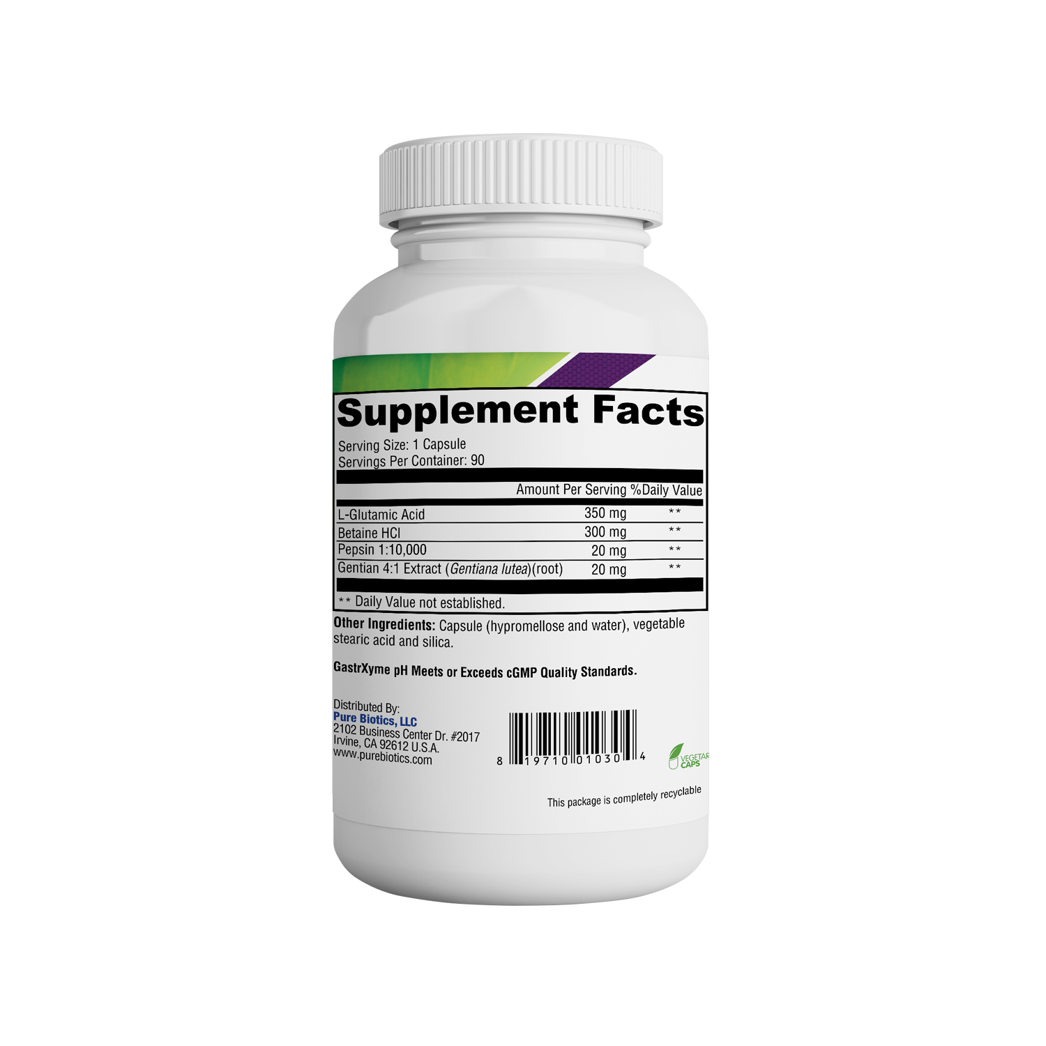 GastrXyme™ pH provides nutritional support for the digestive system by featuring the acidifying factors Glutamic Acid. Additionally, GastrXyme™ pH provides the proteolytic enzyme, pepsin; along with the herbal bitter, gentian root, which has been traditionally used to support normal digestion. Glutamic acid and betaine HCl are necessary for adequate absorption of protein, calcium, vitamin B12, iron and more.*